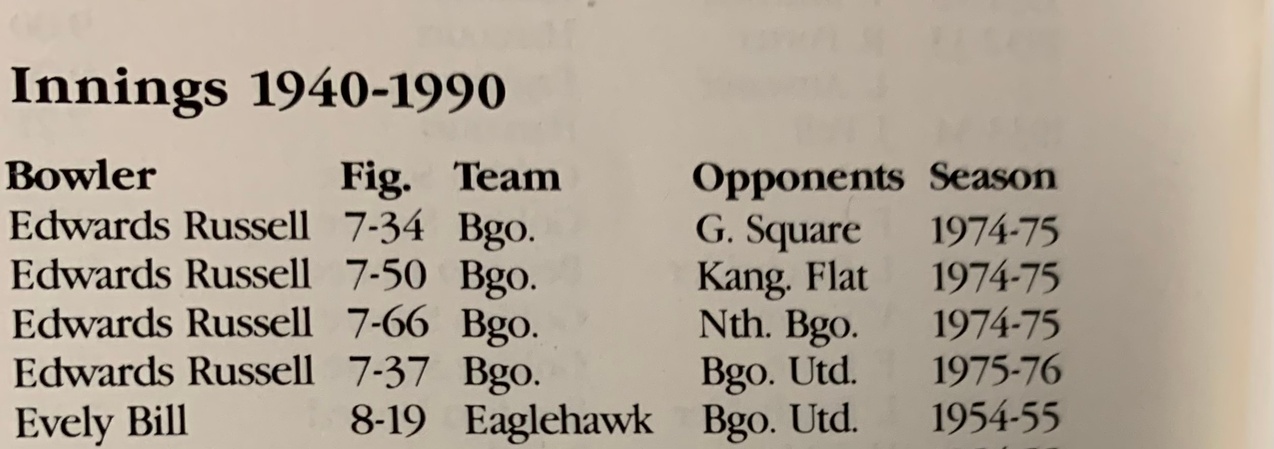 I only recently discovered that in the 50 years of Bendigo Cricket from 1940 to 1990, only two bowlers captured 7 wickets or more in an innings on three occasions in any one season. One was the Hall Of Famer, Hank Watts for Sandhurst and the other was an opening bowler for Bendigo. Our Premierships there in 1976 and 1977 remain two of the highlights of my life.